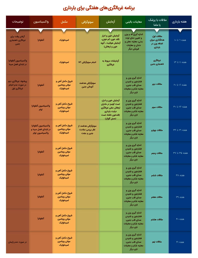 سپس با توجه به نتایج آزمایش، در صورت مثبت بودن نتیجه آزمایش بارداری، برای شما پرونده بارداری تشکیل خواهد شد. مراقبت هاي معمول بارداري طی 8 بار ملاقات در دو نیمه اول ودوم بارداري(2 ملاقات در نیمه اول و 6 ملاقات در نیمه دوم) به مادر ارايه می گردد. زمان ملاقاتهای معمول بارداري عبارتست از هفته 6 تا 10، هفته 16 تا 20، هفته 24 تا 30، هفته 31 تا 34، هفته 35 تا 37، هفته 38، هفته 39 و هفته 40 بارداري.