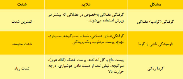 جدول زیر انواع مشکلات گرمایی، علائم و شدت آنها را نشان میدهد.