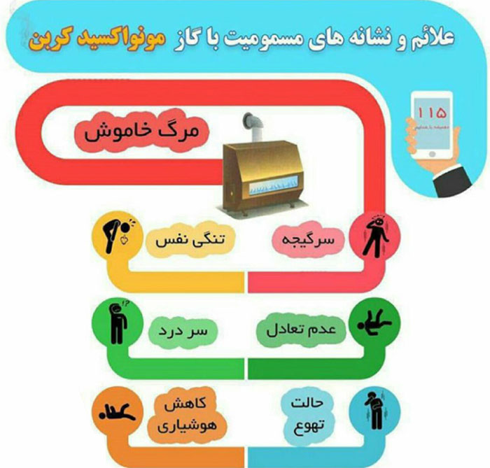 - علایم مسمومیت با مونواکسید کربن را بشناسید: سردرد، ضعف جسمانی، سرگیجه، تهوع و استفراغ، خواب آلودگی.