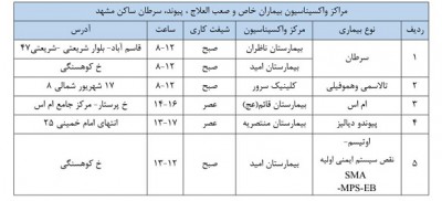 دکتر جواد رجبیان، در گفتگو با وب دا با اشاره به اینکه بیماران سرطانی می توانند به بیمارستان های ناظران و امید مراجعه کنند و واکسن خود را دریافت کنند، اظهار کرد: کلینیک سرور برای بیماران تالاسمی و هموفیلی ،بیمارستان قائم(عج) برای بیماران مبتلا به ms و مرکز دیالیز و پیوند اعضا منتصریه نیز برای بیماران کلیوی اختصاص یافته است.