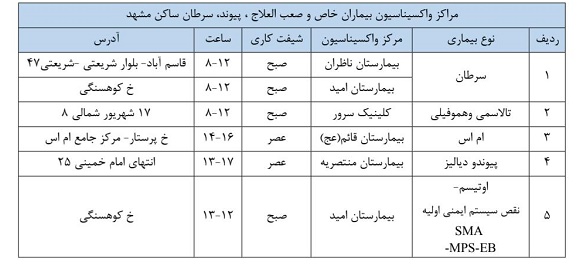 مدیر امور بیماریهای خاص معاونت درمان دانشگاه علوم پزشکی مشهد افزود: بیماران خاص، صعب العلاج و سرطانی بالای 18 سال ساکن شهرستان ها که تا کنون موفق به انجام واکسیناسیون نشده اند می توانند با داشتن مدارک شناسایی و بیماری به شبکه های بهداشت و درمان محل سکونت خود مراجعه کنند.