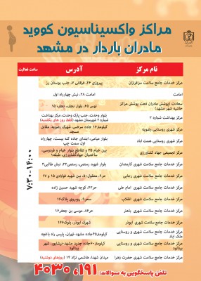 مدیر گروه سلامت، جمعیت و خانواده دانشگاه علوم پزشکی مشهد از فعالیت 15 مرکز منتخب واکسیناسیون کرونا ویژه دو گروه مادران باردار و شیرده در مشهد و حومه خبر داد و گفت: از مجموع 96 هزار مادر باردار و شیرده (تا 42 روز بعد از زایمان)در حوزه تحت پوشش دانشگاه علوم پزشکی مشهد 70 تا 80 درصد آنها جزو گروه هدف تزریق واکسن کرونا هستند.