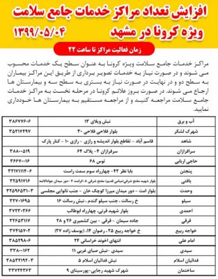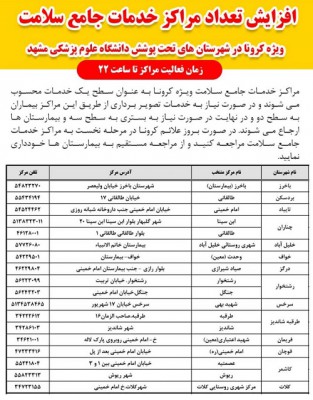 همزمان با شیوع موج دوم کووید -۱۹ در کشور، خدمات فعال ۳۵ مرکز خدمات جامع سلامت منتخب کرونا در مناطق تحت پوشش دانشگاه علوم پزشکی مشهد ادامه دارد.